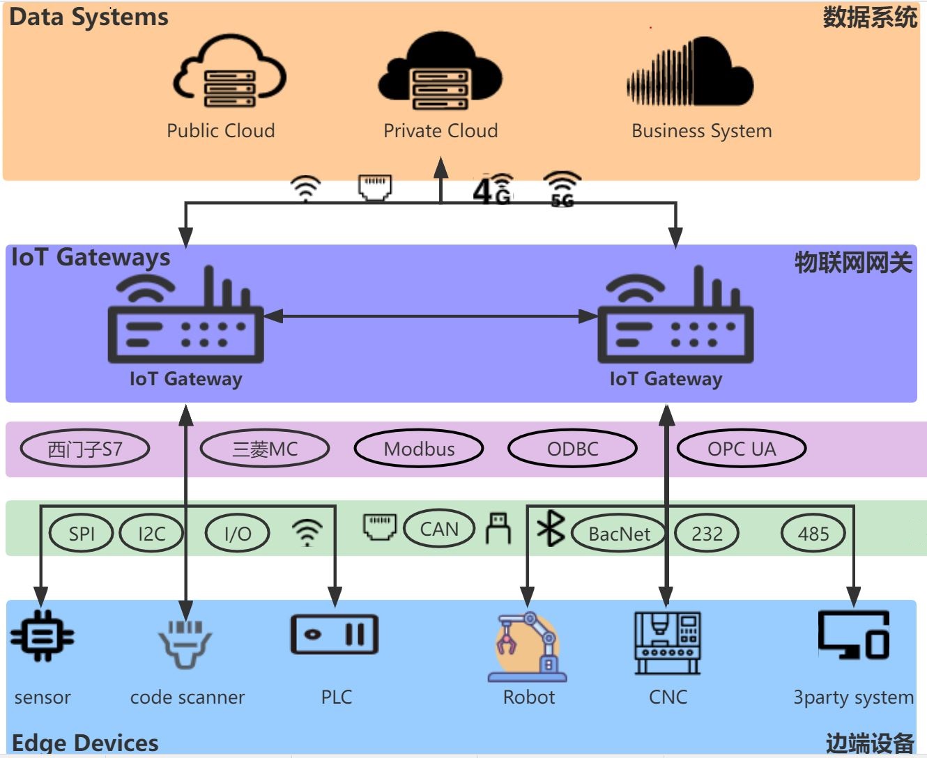 - 通过可视化配置,轻松连接工业现场设备和系统(如PLC、扫码枪、数据库、串口设备、上位机、OPC Server、OPC UA Server、Mqtt Server等),并且与MES、SCADA交互数据。